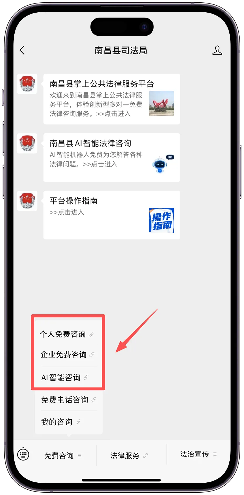 还在为法律问题四处托人?即日起,南昌县群众有了专属“秒回”神器——全新升级的“南昌县司法局”微信公众号把公共法律服务大厅搬进了手机,功能多、速度快、全免费,真正实现“数据多跑路、群众少跑腿”!