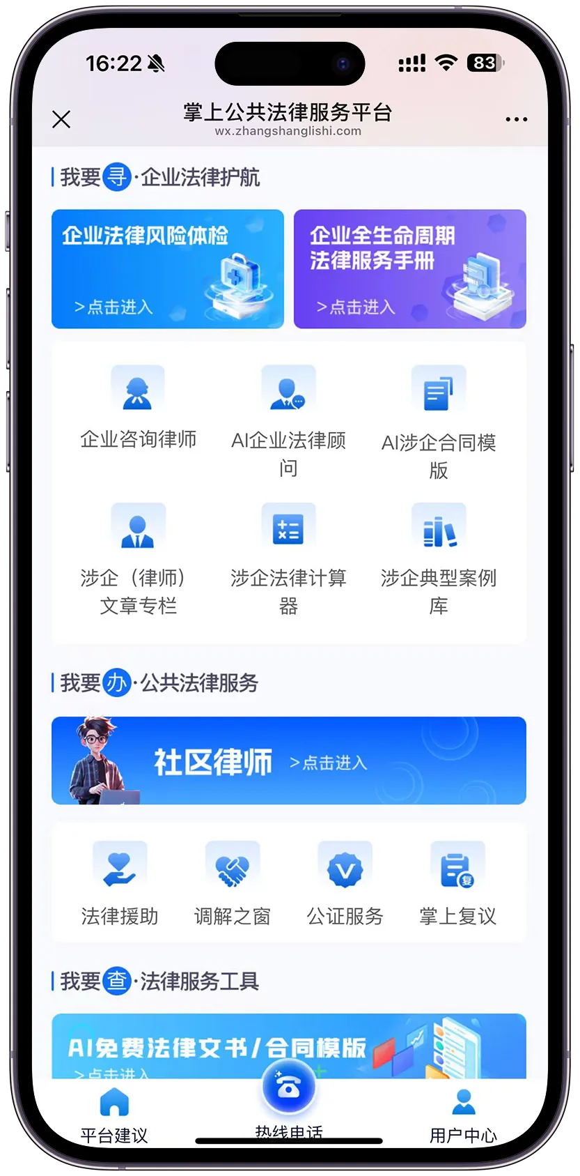 集成了企业法律风险评估(含专项体检与全生命周期健康诊断)、24小时在线律师咨询、AI企业法律顾问、AI法律文书生成、涉企法律计算器及典型案例库等,全方位筑牢企业合规防线。