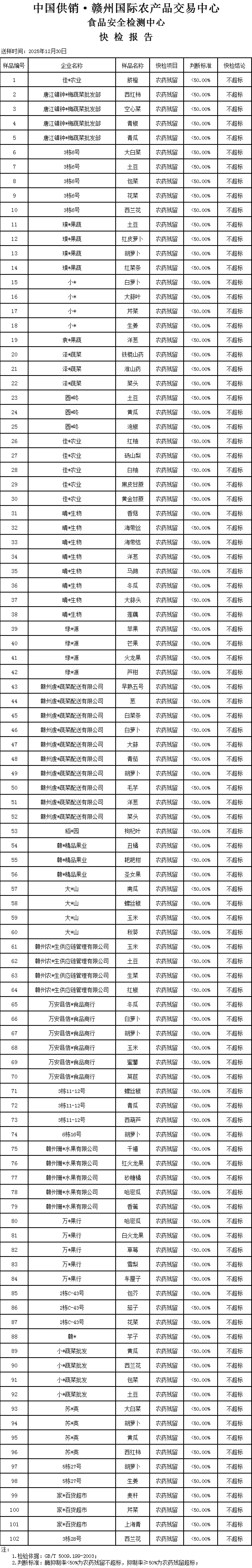 赣州中农批市场2025年12月30日农产品农残抽样检查