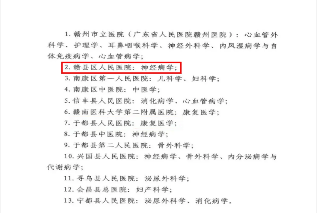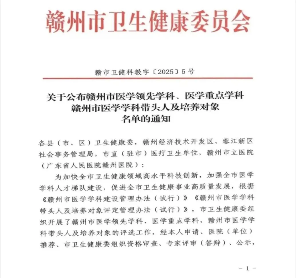 近日,赣州市卫生健康委员会正式下发《关于公布2025年赣州市医学重点学科名单的通知》(赣市卫健科教字〔2025〕5号),赣县区人民医院(赣州市人民医院赣县医院)神经病学成功入选“赣州市医学重点学科”。此次获评,标志着医院神经病学学科建设迈上新台阶,专业能力获得市级权威认可,更意味着区域神经疾病诊疗服务水平迈上了一个新台阶。