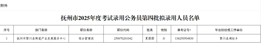 根据《江西省2025年度考试录用公务员公告》规定,经笔试、面试、体检、考察等程序,确定夏圆圆(因怀孕缓录)为抚州市2025年度考试录用公务员第四批拟录用人员。现予以公示。