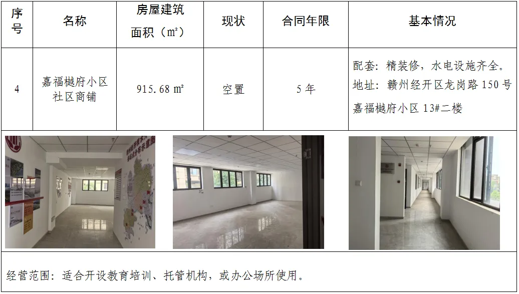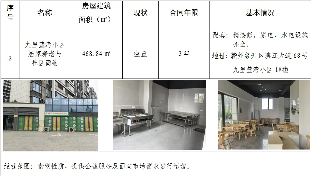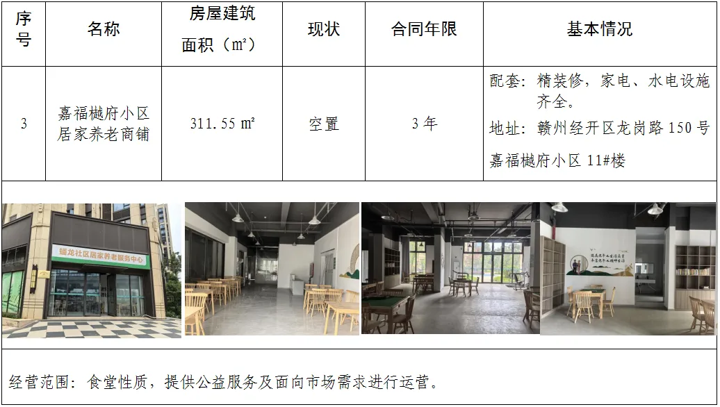受赣州经济技术开发区蟠龙镇街道居委会委托,江西省欧潭智慧生活服务有限公司拟对赣州经开区蟠龙镇极少墅二期、九里蓝湾、嘉福樾府小区居家养老及社区商铺资产进行公开招租,现将有关事项公告如下:
