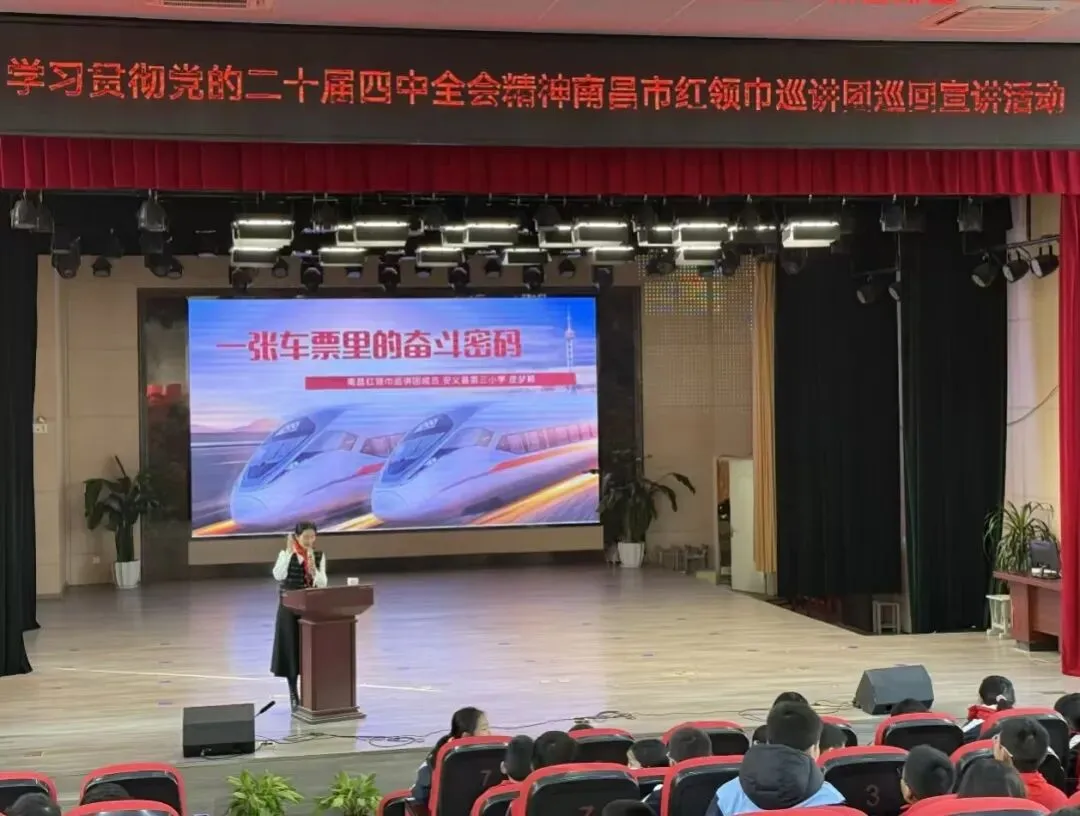 为深入学习宣传贯彻党的二十届四中全会精神,12月30日,南昌市红领巾巡讲团走进安义县第三小学开展主题宣讲。巡讲团成员皮梦颖老师以“一张车票里的奋斗密码”为主题,为队员们带来一堂生动思政课。