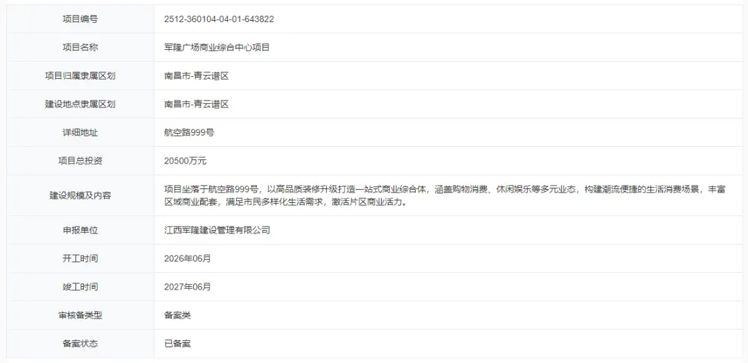 近日,江西省投资项目在线审批监管平台公示了军隆广场商业综合中心项目备案信息。