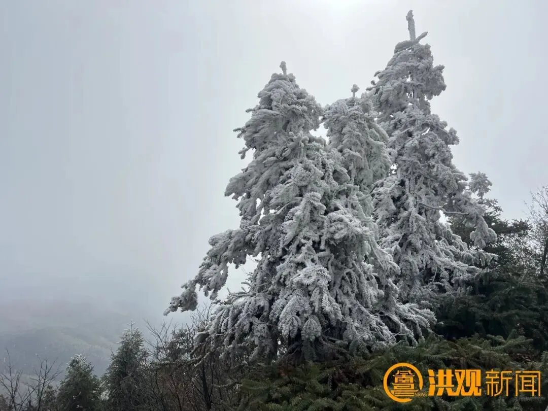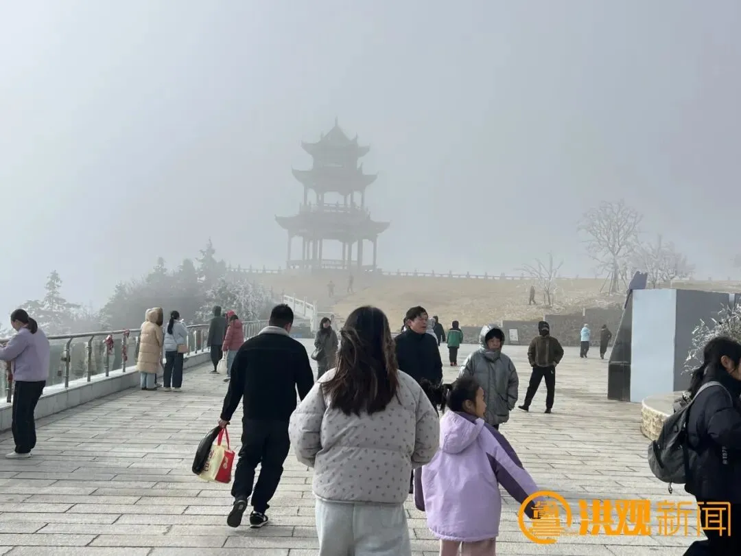 在曲折连绵的九天星廊、视野开阔的揽胜广场,许多搭乘梅岭云端索道上山的游客在此欣赏雾凇。步道上,大家或三两结伴慢行,或停下脚步举着手机对着远处雾中的亭台与覆霜的林木拍照留念;孩童们裹着厚实的棉服,蹦跳着穿梭在人群中,时不时抬头望向被雾凇妆点的树梢,眼里满是好奇。