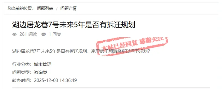 近日,有网友在“问政赣州”平台上咨询:赣州湖边居龙巷7号未来5年是否有拆迁规划。