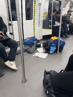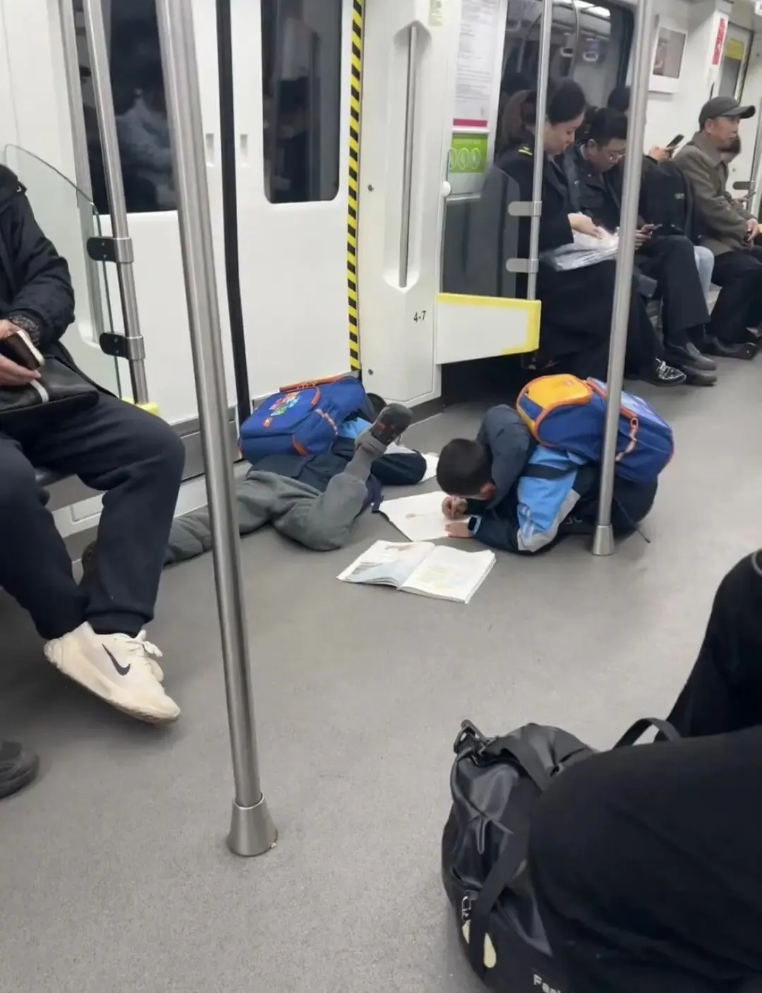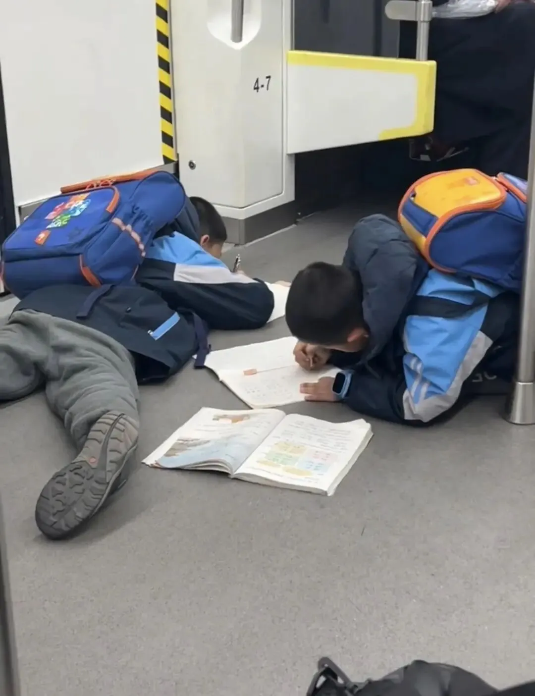 2026年1月1日,拍摄视频的博主告诉记者,他当天上午在南昌地铁2号线上看到这一幕。当时两名背着书包的小男孩上车后不看车上的乘客,也不找座位,一咕噜滑铲倒地,趴在地上从书包里拿出书本和笔开始写作业,应该是在抄语文书上的生字。该博主说,他当时看到这一幕感觉很有趣,也很温馨,就拍下了一段视频。