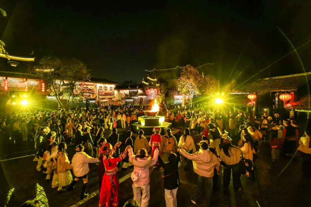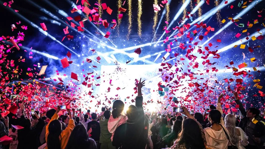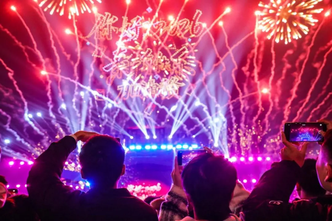 夜幕降临,欢乐氛围持续升温。“赣南小镇”内燃起熊熊篝火,身着民族服饰的演员与游客手拉手围成圆圈,在欢快的旋律中载歌载舞,凛冽寒风丝毫阻挡不了大家的热情。跨年夜专属的三场主题演出轮番炸场:国风跨年盛典,知名大咖、网络红人亲临现场,国风舞台温情开演,全方位展现东方魅力;时光音乐派对,以流行音乐+摇滚为主,带领现场游客万人大合唱;零点狂欢派对,以男团女团PK+摇滚蹦迪为主,将跨年音乐氛围推向高潮!其中更有多轮惊喜抽奖环节贯穿演出全程,万元新年大礼包、熊出没限定周边等丰厚奖品接连送出,让游客在狂欢之余收获满满惊喜,尽兴而归。