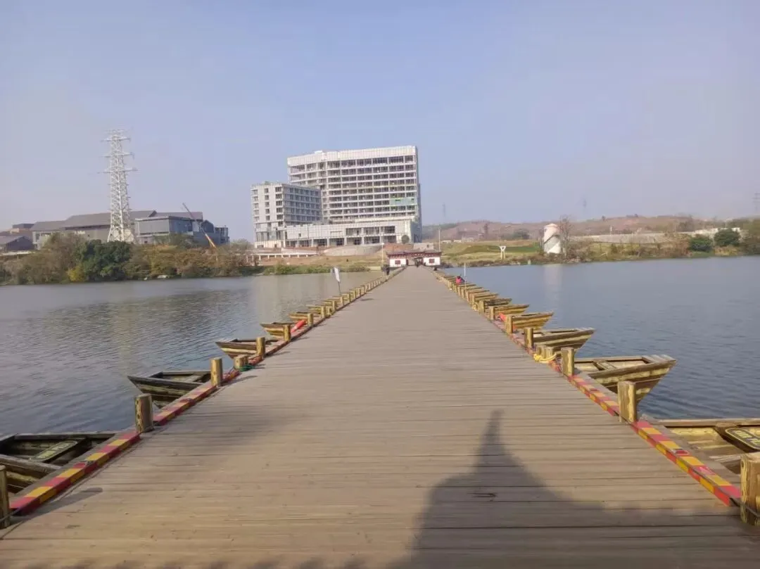 浮桥主体由17渡浮舟和2座趸船组成,桥长225米,宽5米,采用钢木混合结构,船体为钢质材料定制,面板为木质材料,整体以船锚、钢缆与岸边系缆桩多重固定,配备拖轮1艘、工作船2艘,保障通行平稳安全。