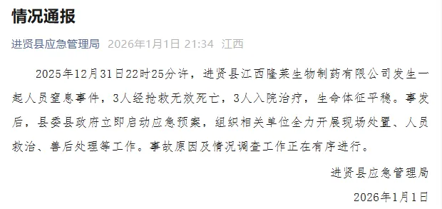 2025年12月31日22时25分许,进贤县江西隆莱生物制药有限公司发生一起人员窒息事件,3人经抢救无效死亡,3人入院治疗,生命体征平稳。事发后,县委县政府立即启动应急预案,组织相关单位全力开展现场处置、人员救治、善后处理等工作。事故原因及情况调查工作正在有序进行。