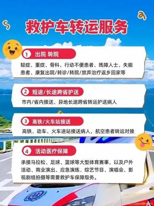这些我们都可以做,我们是非急救救护车,专门干的就是长途跨省转运病人这件事情,我们家可以电话预约,最快15分钟出车,转运病人是我们的强项。不管您是出院还是转院,我们都可以做。