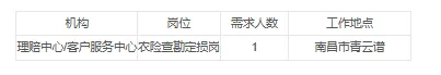 江西省人力资源有限公司因工作需要,现向社会公开招聘农险理赔人员1名,拟派遣至中国人民财产保险股份有限公司南昌市分公司下辖区县支公司,现将有关事项公告如下:一、任职条件全日制专科及以上学历,农业相关专业(植物保护、畜牧防疫、林业)、保险、金融、财务、经济、信息技术、法律、管理、地理信息等。二、岗位职责①与农险部对接,对本地市专属农险产品中涉及理赔的条款、方案提出建议,并建立实施产品风险反馈机制;②负责农险理赔成本管理,开展农险理赔业务分析和风险反馈、未决赔款监控和管理;③负责农险案件的查勘、定损工作。以在线远程方式对于辖内协赔模式和农户自助查勘农险案件线上视频查勘、定损、在线进行单证资料收集及审核、立案工作;④负责与农户及协赔人员对接,在线指导农户自助查勘、协赔人员现场查勘工作;⑤负责对于符合“小额案件快速通道”条件案件的单证审核、定损及立案工作;⑥指引客户后续理赔流程,妥善解答和受理客户咨询与投诉;⑦负责对农险案件保险责任进行核定;负责开展重复赔案核查,杜绝重复理赔;⑧负责对农险案件真实性、保单责任、定损结果的合理性和准确性进行审核,对不合理、不准确的部分提出整改意见。三、岗位需求