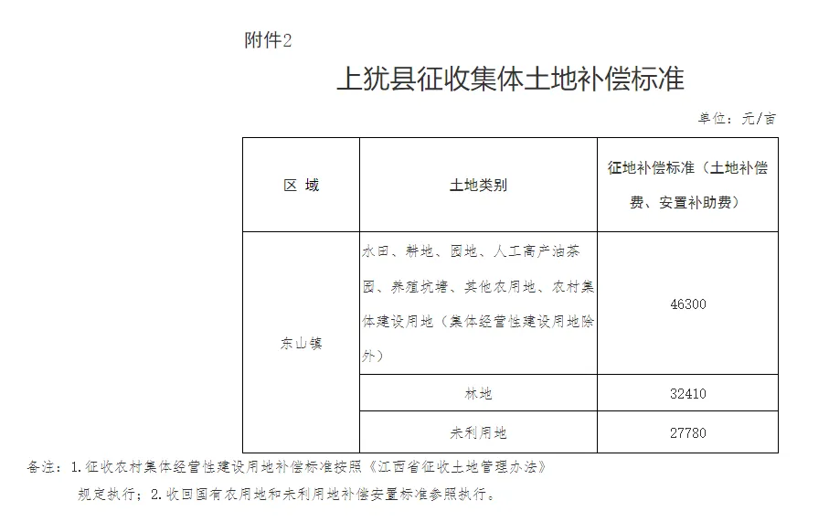 (二)征地补偿标准按照《江西省人民政府关于公布全省征地区片综合地价的通知》(赣府字〔2023〕23号)《关于调整上犹县征收集体土地补偿标准的通知》(上府字〔2023〕13号)等文件相关规定执行(详见附件2)。