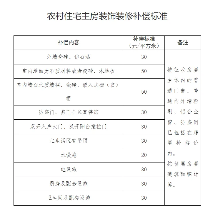 (一)被征收住宅主房装饰装修按照《农村住宅主房装饰装修补偿标准》(详见附件4)给予补偿。
