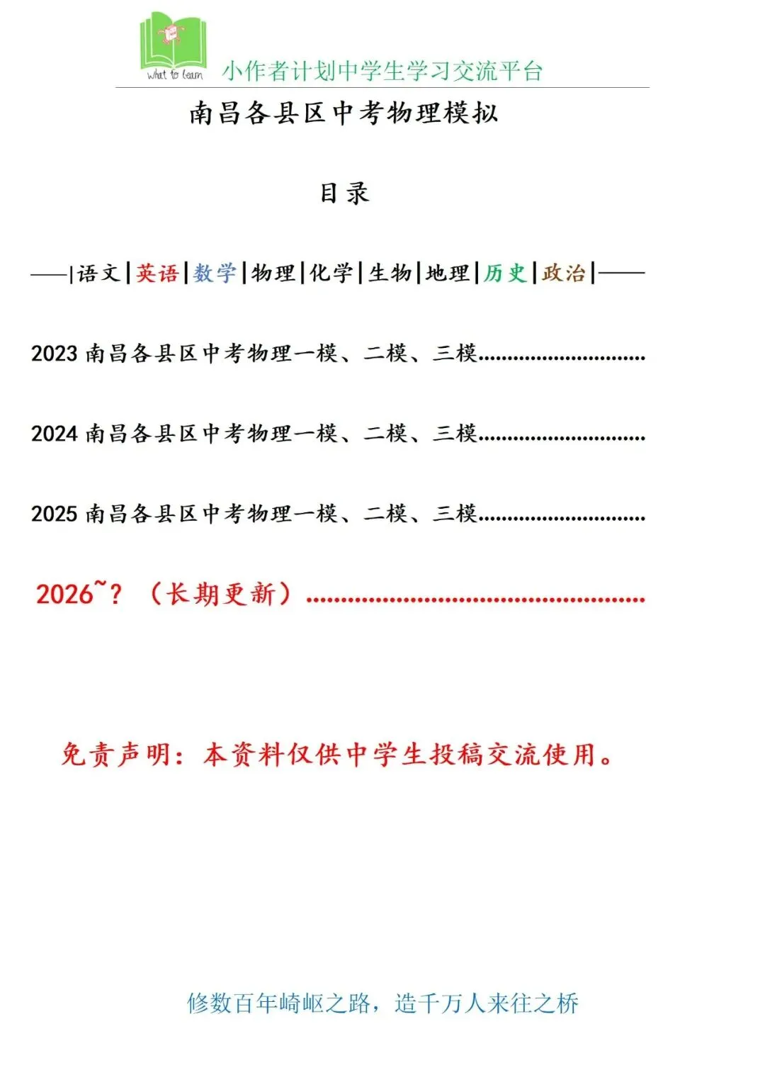 >南昌各县区中考物理一模、二模、三模试题及答案暨2026中考复习刷题攻略