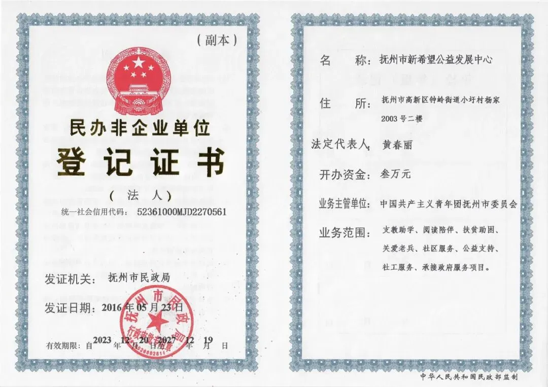 2016年5月23日,抚州市新希望公益发展中心取得由抚州市民政局颁发的民办非企业单位登记证书。