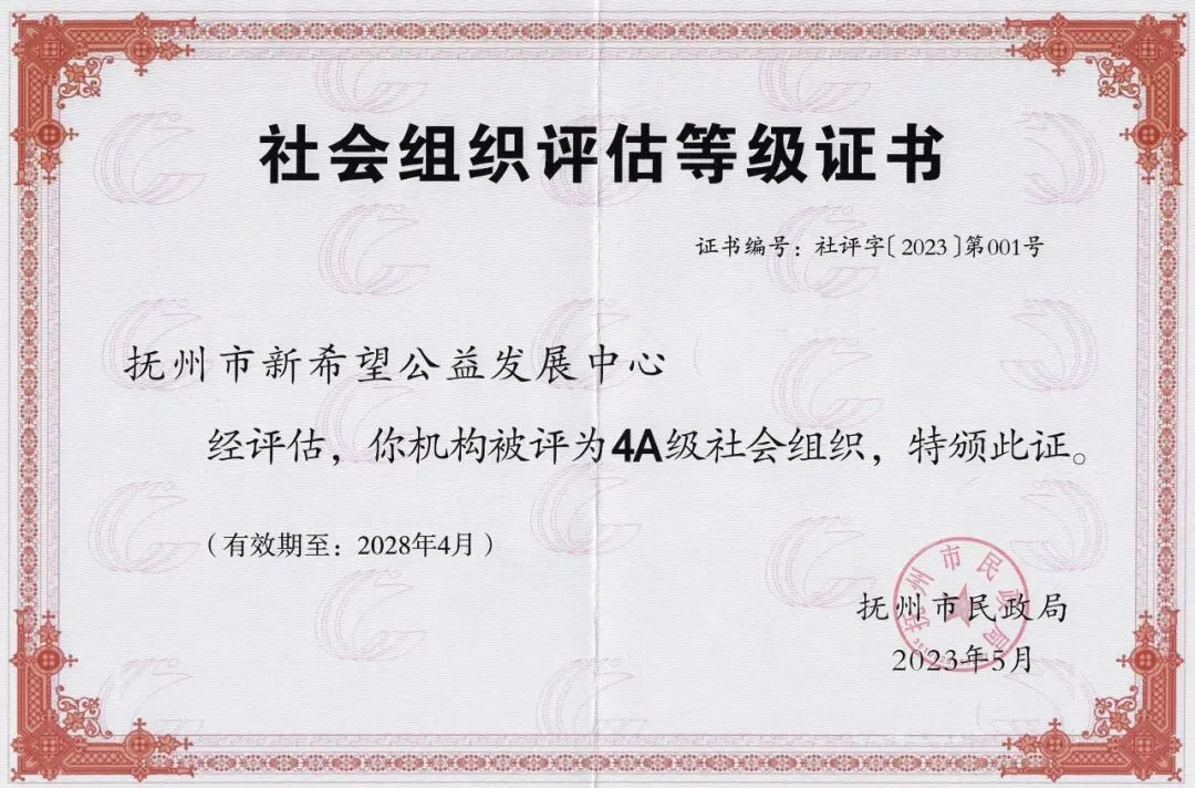 由抚州市民政局举行的2022年度社会组织等级评估中,抚州市新希望公益发展中心被评定为4A级社会组织。