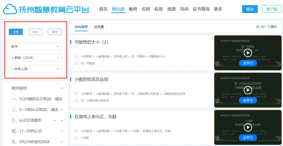 第二步:在左侧栏中依次选择学段(小学/初中/高中)、学科、教材版本和教材册别后,选择需要学习的章节和课程,点击“去学习”。