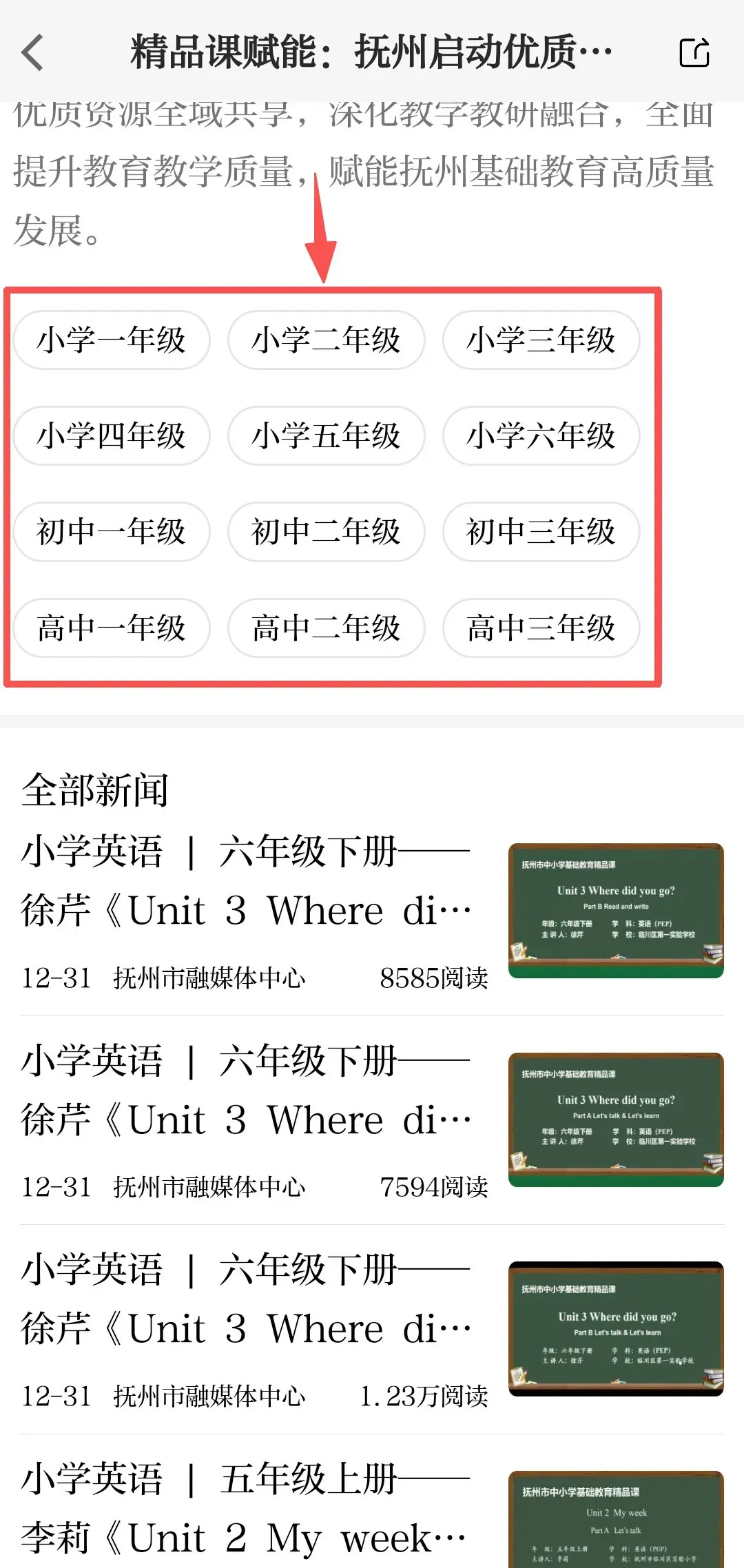 第二步:进入首页,点击任一选定区域,进入“抚州市中小学精品课”页面。