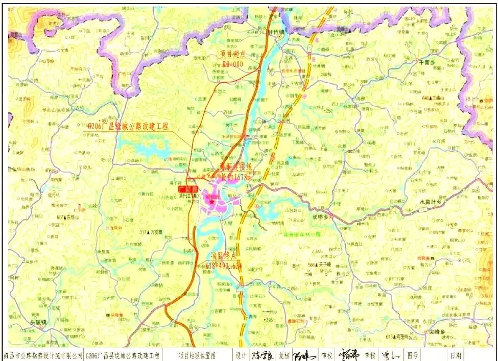 G206广昌县绕城公路改建工程建设地点位于广昌县境内,路线起于甘竹镇洙溪村下堡附近,终于老G206与G1517莆炎高速广昌南出口连接线附近,主线全长18.474公里,其中新建段长度16.94公里、拓宽利用段长度1.534公里,全线采用双向四车道一级公路标准建设,设计速度为80公里/小时。