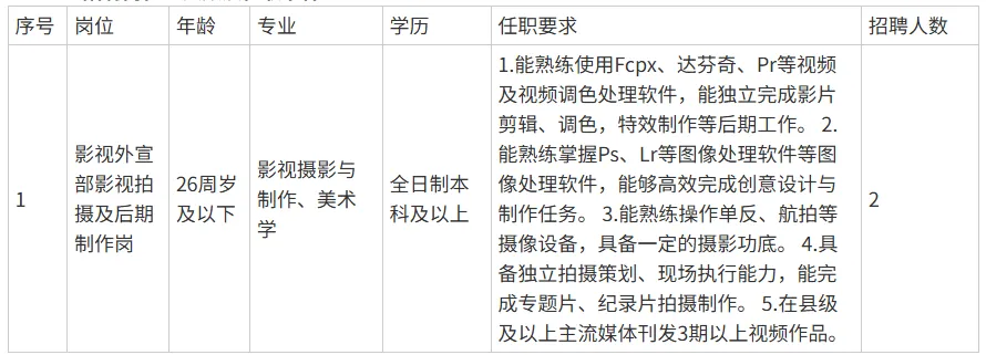 因业务发展需要,赣州市赣县区融启文化传媒有限公司影视外宣部现面向社会公开招聘派遣制员工2名,现将有关事项公告如下: