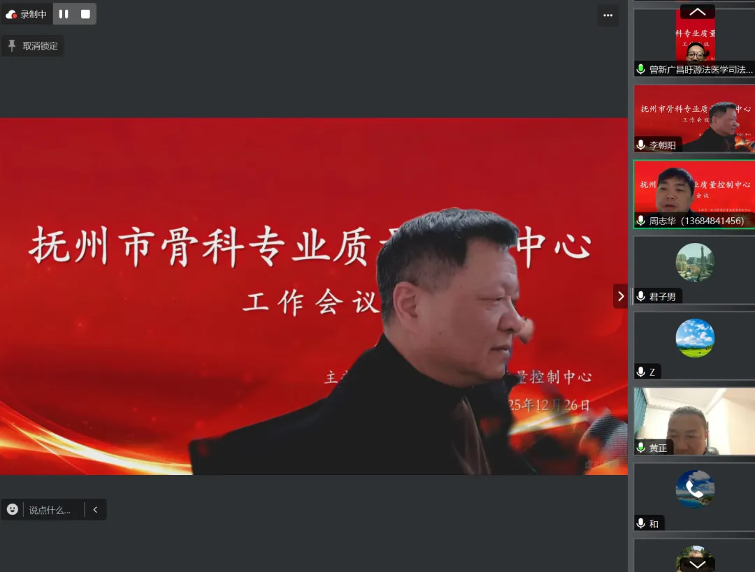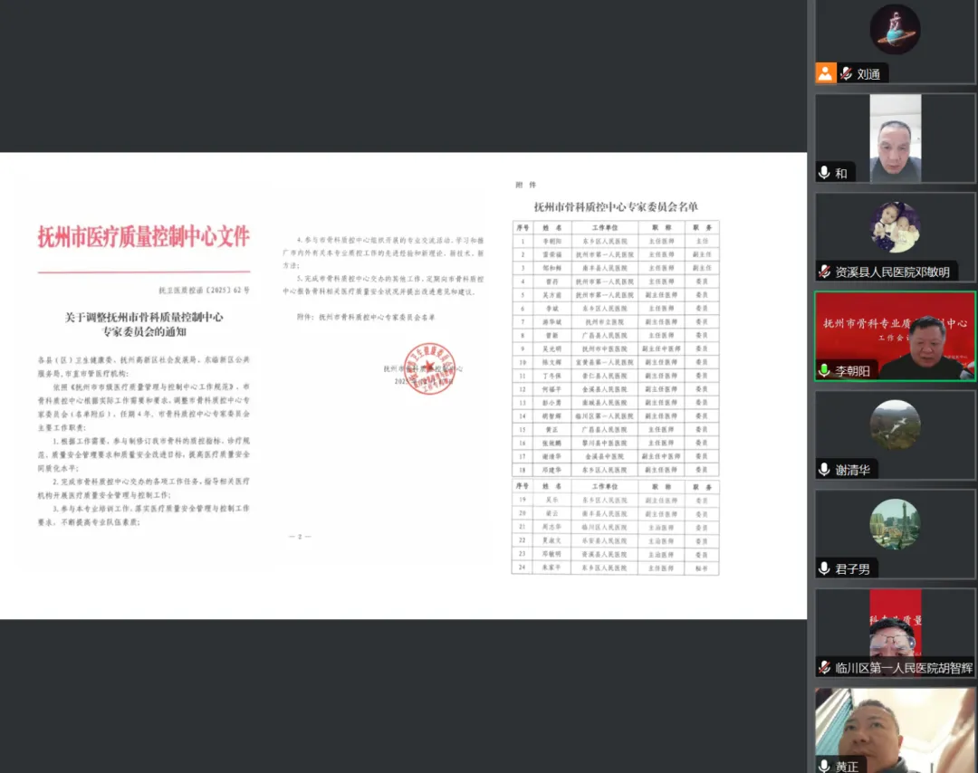 12月26日,抚州市骨科专业质控中心第二届第一次线上工作会议顺利召开,市骨科质控中心委员及全市市直市管、各区县医院骨科骨干共 65人参会。会议由市骨科质控中心主任、我院骨科主任李朝阳主持。