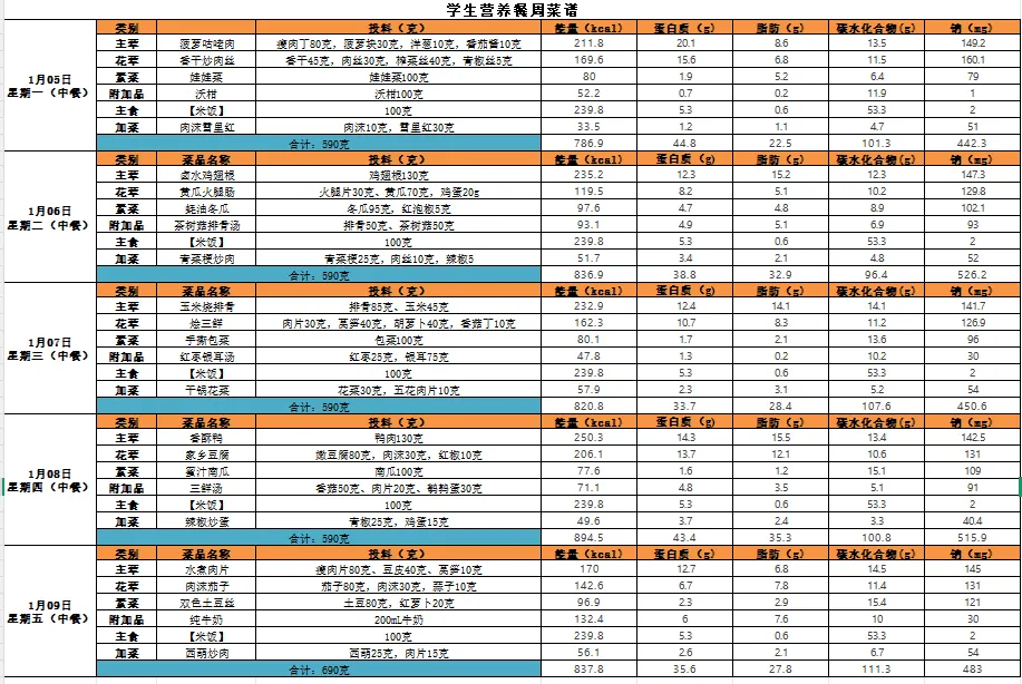 【阳光午餐】南昌二中高新校区一周食谱(1月5日-1月9日)