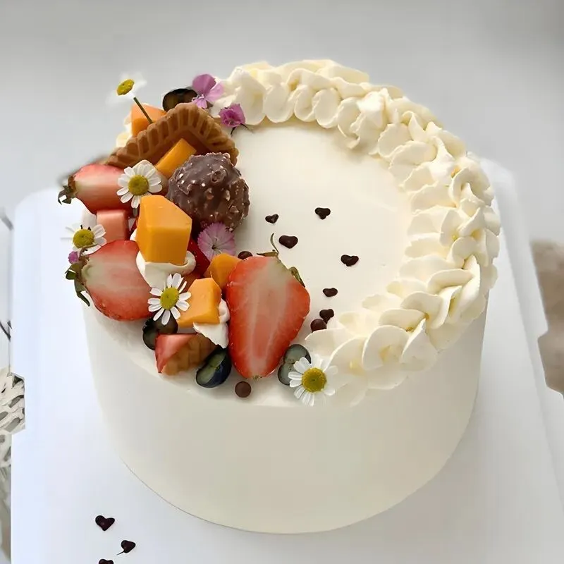 蛋糕胚选用的是优质的面粉,经过精心配比和烘焙,口感松软细腻,带着淡淡的麦香,就像小时候妈妈亲手做的蛋糕,充满了家的温暖。奶油则选用动物奶油,它天然健康,不含反式脂肪酸,入口即化,细腻丝滑的口感如同云朵般轻盈,每一口都能感受到大自然的馈赠。水果都是当天新鲜采购的,草莓清甜多汁,芒果浓郁香甜,蓝莓酸甜可口……它们不仅为蛋糕增添了丰富的色彩,更带来了清新的果香,让蛋糕的口感层次更加丰富。