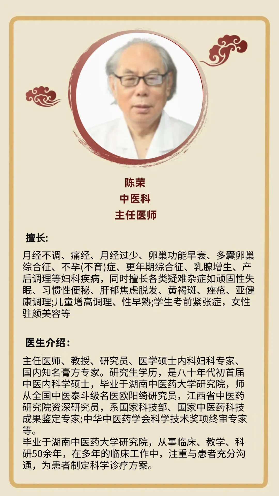 主任医师、教授、研究员、医学硕士内科妇科专家、国内知名膏方专家。研究生学历,是八十年代初首届中医内科学硕士,毕业于湖南中医药大学研究院,师从全国中医泰斗级名医欧阳绮研究员,江西省中医药研究院资深研究员,系国家科技部、国家中医药科技成果鉴定专家:中华中医药学会科学技术奖项终审专家等。