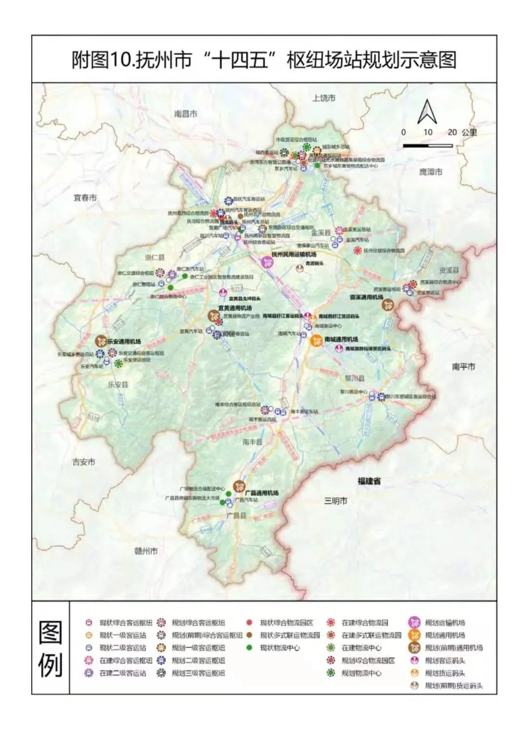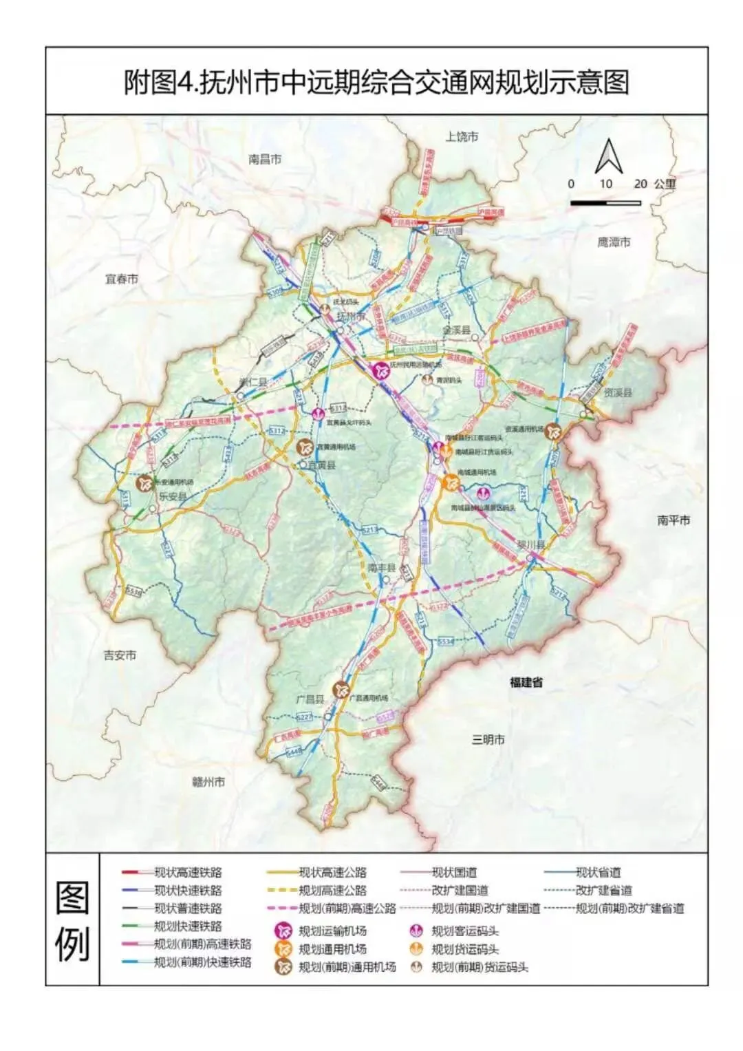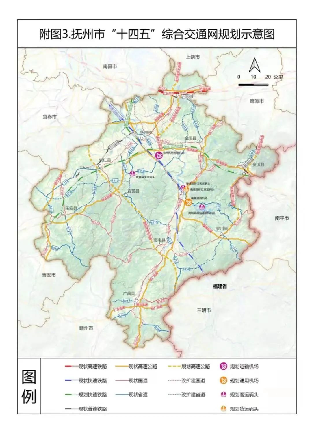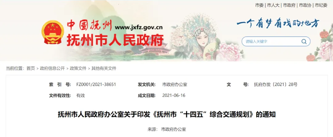 近日,抚州市人民政府网发布关于印发《抚州市“十四五”综合交通规划》(下称规划)的通知,主要涉及中心城区及重要交通枢纽的规划,提出十四五期间要新建抚州机场、温武抚吉铁路、南昌至南丰(赣闽界)高速公路昌抚大道、抚州至崇仁、金溪、南城快速路等重大项目。积极推进景鹰(抚)瑞铁路、东乡至抚州至崇仁市域铁路前期准备工作。