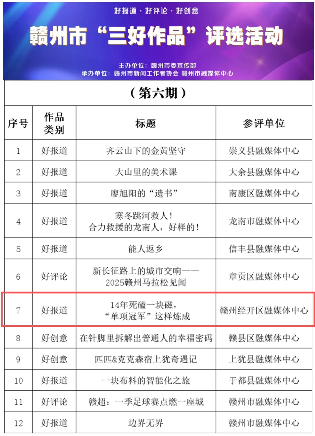 为深入贯彻落实习近平总书记考察江西重要讲话精神,紧扣省委、市委中心工作,充分反映习近平新时代中国特色社会主义思想在赣南的生动实践,弘扬主旋律,振奋精气神,日前,根据《关于评选全市“三好作品”的通知》精神,经自评推荐、初评、专家组复评等程序,评选出2025年度第六期赣州市“三好作品”。