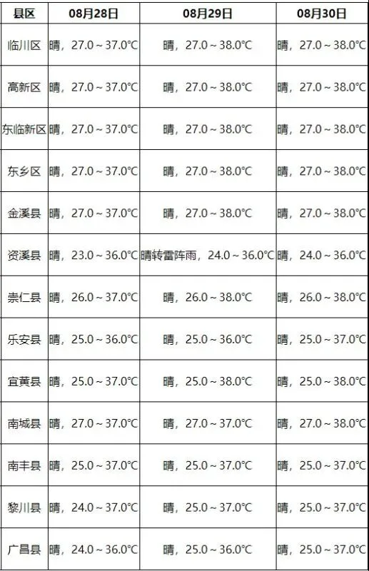 抚州市气象台16时发布天气预报:预计今天晚上晴天多云,明天白天晴热高温,局部午后到傍晚有阵雨或雷阵雨,偏南风2~3级,最高气温36℃~37℃,最低气温23℃~27℃;明天晚上晴天多云,后天白天晴热高温,局部午后到傍晚有阵雨或雷阵雨。
