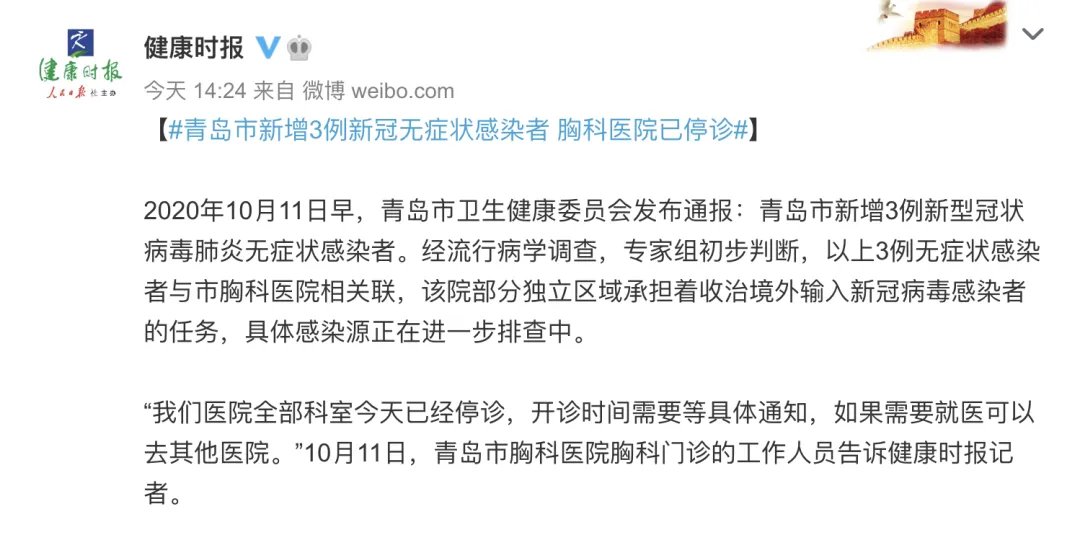 据报道,10月11日,青岛市胸科医院胸科门诊的工作人员表示,医院全部科室今天已经停诊。工作人员表示,该医院是收治新冠肺炎的定点医院,现在还有新冠肺炎患者在院,但是确诊患者的住院区域与其他住院患者是分开的。