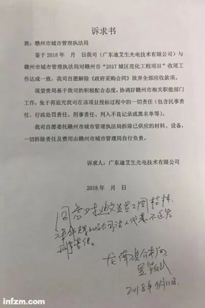 ▲涉案公司与办案民警签署的“诉求书”。(图片由广东迪艾生光电技术有限公司 提供)