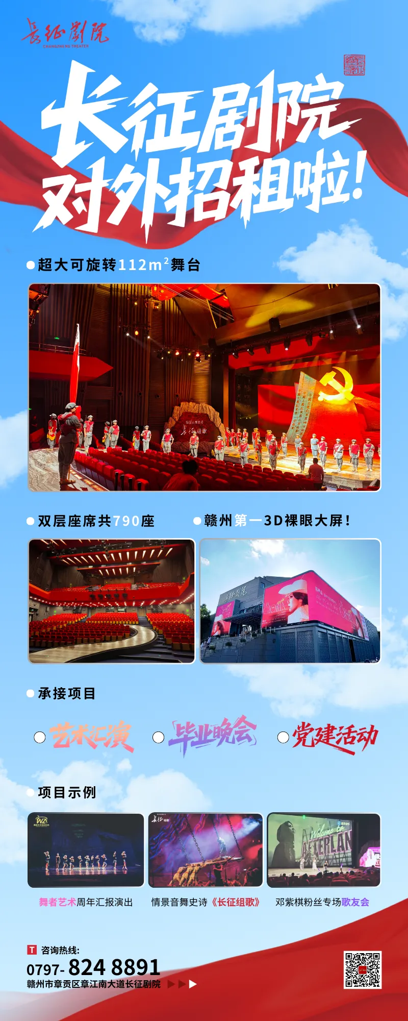 长征剧院是赣州中心城区首座现代化红色文旅演艺沉浸式剧场,拥有赣州第一3D裸眼大屏,章江河畔最佳广告位;112m²超大环形舞台,打造360°沉浸式观演体验;场内近800个座位,满足各类活动需求;配套化妆间、排练室,为演出做好充足准备;只有你想不到,没有我们办不了。