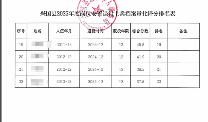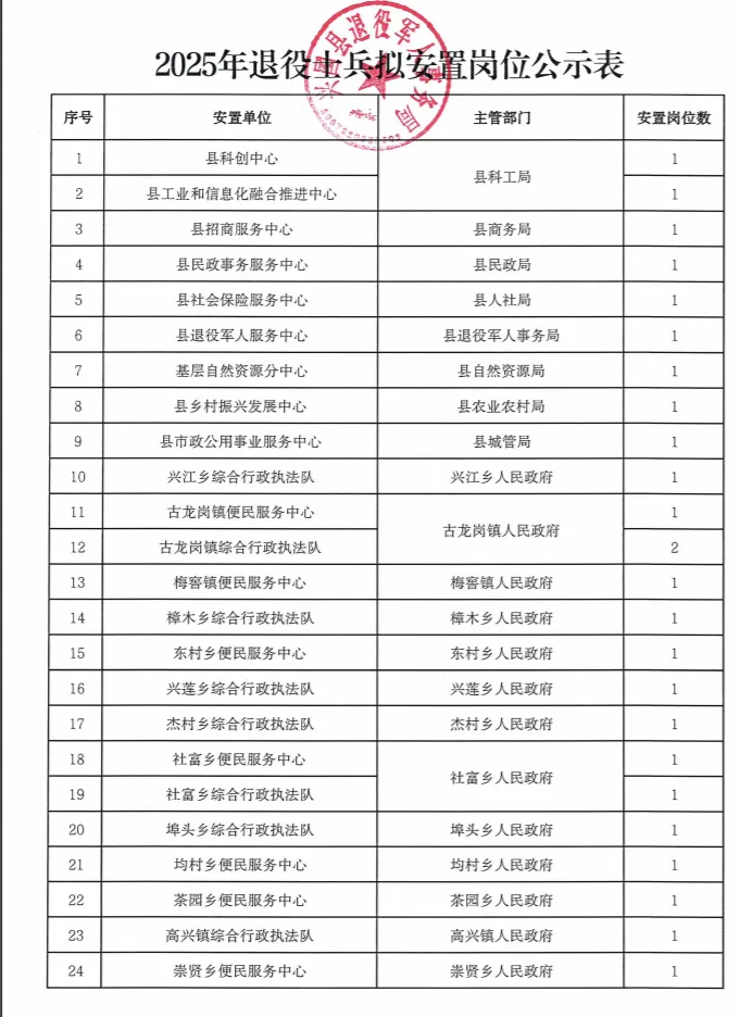 >【江西省赣州市兴国县】2025年符合政府安排工作退役士兵安置岗位公示