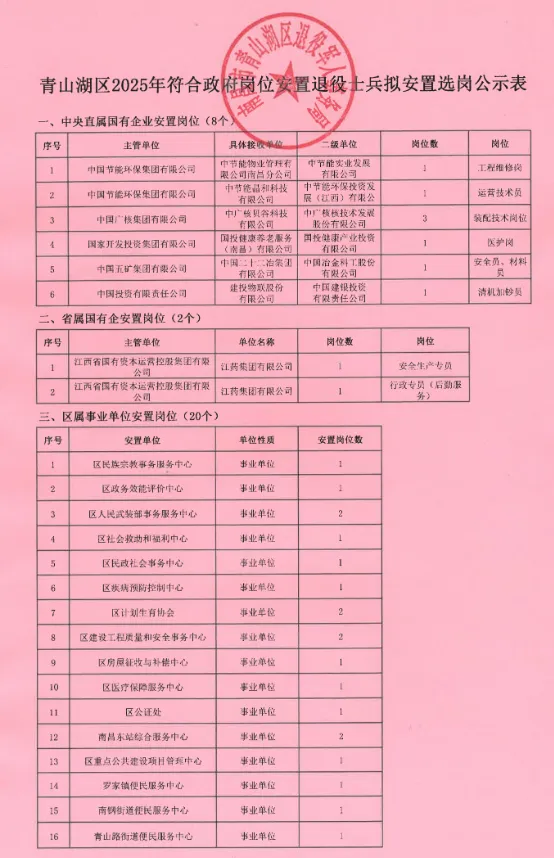 >【江西省南昌市青山湖区】2025年符合政府安排工作退役士兵安置岗位公示