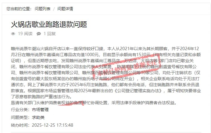 赣州说原牛潮汕火锅自开店以来一直保持较好口碑,本人从2021年以来为其长期顾客,并于2024年12月2日在赣州说原牛嘉福尚江尊品店充值1000元,目前显示余额尚有1530元(均有相关充值记录和余额证明),但是近期想去吃,发现赣州说原牛嘉福尚江尊品店、万达店、大观店等3家门店均已歇业关闭,赣州市说原牛餐饮管理有限公司法定代表人刘某勇、 陈某明旗下注册的赣州创盛壹号餐饮有限公司、赣州市说原牛餐饮管理有限公司、赣州旗百盛餐饮管理有限公司等10家公司,均处于注销状态(仅有创盛壹号的最大股东杨某创办的赣州施氏电子有限公司尚在开业),相关企业联系电话均处于无法打通状态,网上了解说原牛大约于2025年6月注销跑路,他们都有会员电话,但注销跑路并未联系会员退款事宜。根据国家市场监督管理总局2025年最新出台的《公司登记管理实施办法》,属于明知快要停业了恶意卷款跑路的严重违法行为。