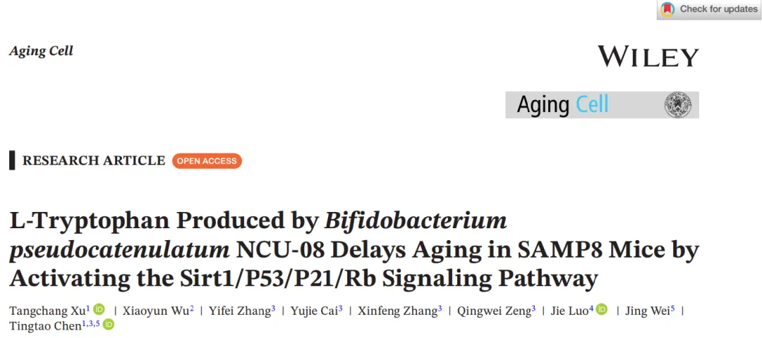 全球人口老龄化持续加剧,预计 2030 年 60 岁以上人口将超 14 亿,年龄相关疾病给社会和经济带来沉重负担。现有抗衰老药物存在副作用、机制不明等问题,临床应用受限,亟需安全有效的抗衰老策略。肠道菌群作为健康衰老的关键因素,益生菌干预是潜在方向,但新型抗衰老益生菌的研发相对滞后。2025年7月11日南昌大学陈廷涛教授团队在《 Aging Cell》发表题为“L-Tryptophan Produced by Bifidobacterium pseudocatenulatum NCU-08 Delays Aging in SAMP8 Mice by Activating the Sirt1/P53/P21/Rb Signaling Pathway”。该研究成功从百岁老人肠道中筛选出新型益生菌,为抗衰老益生菌制剂开发提供了重要数据支撑与理论依据。