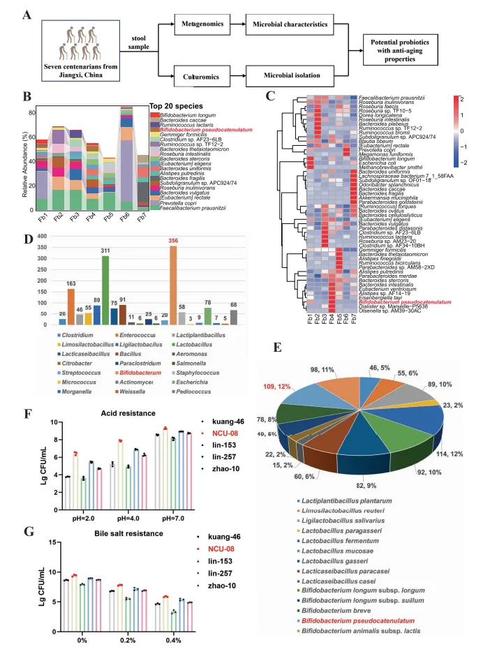 本研究对 7 名百岁老人粪便样本进行宏基因组测序,发现其肠道微生物以厚壁菌门和拟杆菌门为主,假链状双歧杆菌显著富集。结合培养组学分离出 1508 株菌株,其中假链状双歧杆菌 109 株,占比 12%。经生长性能、耐酸耐胆盐筛选,选定 NCU-08 菌株,其体外抗逆性优异,且产酸、耐盐及耐高温特性良好,为抗衰老功能研究奠定基础。