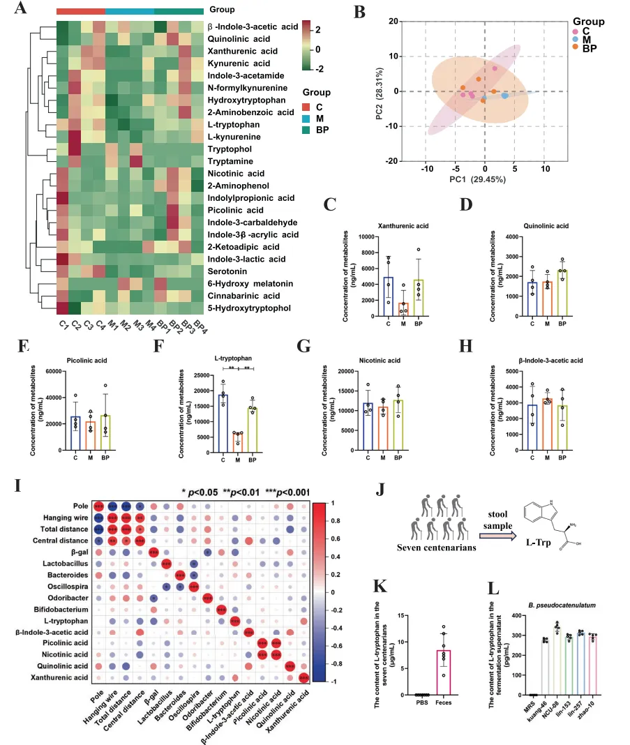 靶向代谢组学分析表明,假小链双歧杆菌NCU-08的抗衰老表型与其核心效应分子——L-色氨酸密切相关。通过聚类热图展示了NCU-08能够重塑衰老小鼠紊乱的色氨酸代谢谱,进而对关键代谢物进行精确定量,发现L-色氨酸的水平在干预后发生了显著提升,将其确定为潜在的关键介质。