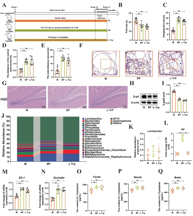 为评估NCU-08 菌株的抗衰老活性,研究者们以快速衰老模型小鼠 SAMP8 为实验对象,开展为期 12 周的灌胃干预实验。杆爬实验、悬尾实验及旷场实验等行为学检测结果表明,NCU-08 干预可显著提升衰老小鼠的运动耐力、肢体平衡力及自主探索能力。组织病理学分析显示,该菌株能够有效缓解小鼠海马区神经元损伤,并显著下调衰老标志物 β- 半乳糖苷酶的表达水平。此外,肠道菌群结构测序分析发现,NCU-08 干预可显著提高衰老小鼠肠道内乳酸杆菌属与双歧杆菌属的相对丰度,同时降低菌群 Simpson 多样性指数,提示其可通过重塑衰老小鼠肠道微生态结构,经 “肠 - 脑轴” 调控通路发挥潜在抗衰老作用。