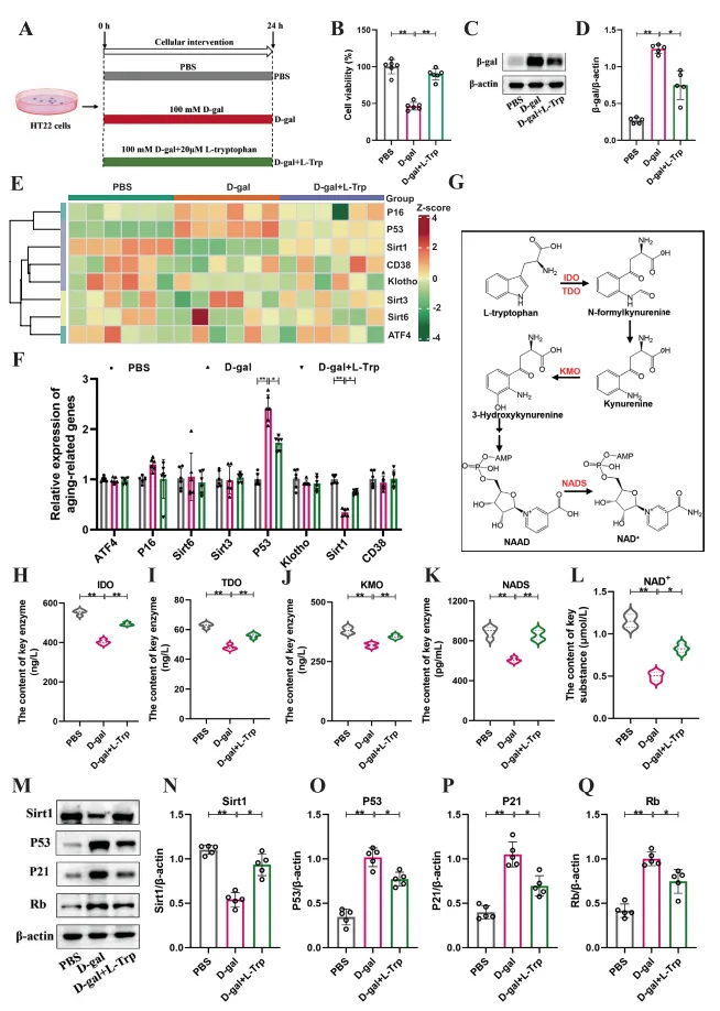 在 HT22 细胞模型中,L - 色氨酸处理可显著提升细胞活力,同时下调衰老相关基因P53的表达水平,并上调Sirt1的表达。机制研究表明,L - 色氨酸可通过色氨酸 - 犬尿氨酸代谢途径促进 NAD⁺合成,进而激活 Sirt1 蛋白,抑制其下游 P53/P21/Rb 信号通路的传导,最终实现延缓细胞衰老的效应。蛋白质印迹(Western blot)实验结果进一步证实,L - 色氨酸处理后细胞内 Sirt1 蛋白表达显著上调,而 P53、P21 及 Rb 蛋白表达水平均显著下降,由此明确了该信号通路在 L - 色氨酸介导的细胞抗衰老过程中具有核心调控作用。