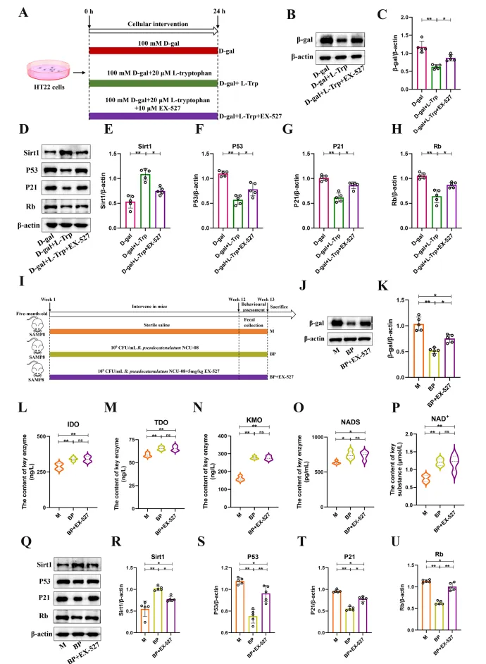 为进一步验证Sirt1在该调控通路中的核心介导作用,本研究引入 Sirt1 特异性抑制剂 EX-527 开展干预实验。细胞实验结果显示,EX-527 处理可显著逆转 NCU-08 与 L - 色氨酸的抗衰老效应,具体表现为 β- 半乳糖苷酶表达水平显著上调、Sirt1 蛋白表达显著下调、P53/P21/Rb 通路蛋白表达显著升高,同时细胞活力明显下降。在动物实验层面,EX-527 干预同样显著削弱了 NCU-08 对衰老小鼠的行为学改善作用及海马神经元保护效应。上述细胞与动物实验结果相互印证,明确证实NCU-08 通过 L - 色氨酸激活 Sirt1/P53/P21/Rb 信号通路,是其发挥抗衰老作用的核心机制。