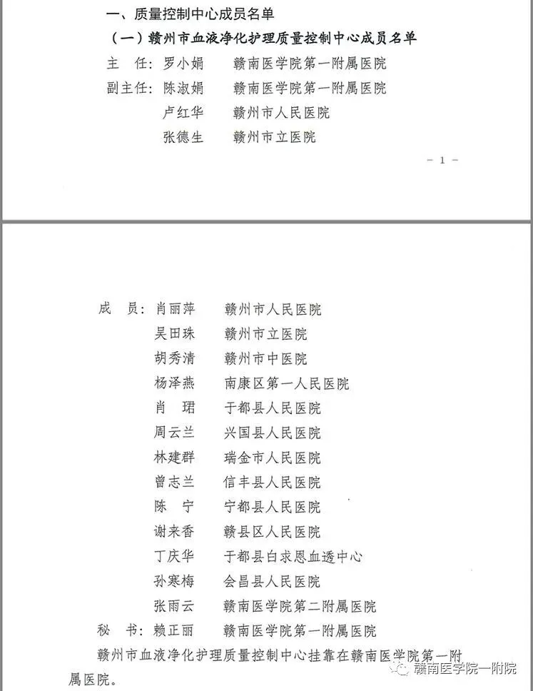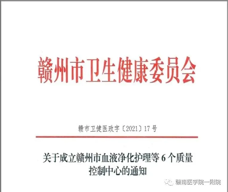 为加强赣州市血液透析护理质量,近日赣州市卫健委下文组建赣州市血液净化护理质量控制中心,该中心在赣医一附院正式落户。