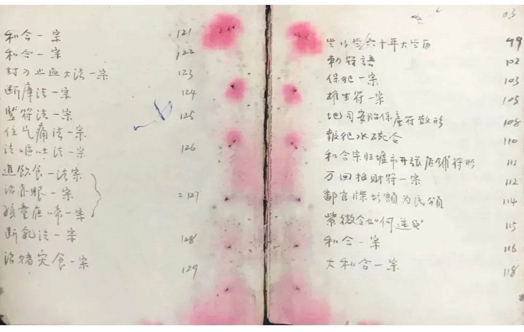 催生符形一宗,救产难硃砂符化吞,地司安胎保产符散形,报犯水碗令,和合宗旺墟市开张店铺符形,万回招财符一宗,鄱官牒坛額为頒,和合一宗,大和一宗,万回聖僧,止血汤火住痛一宗,封刀止血大法一宗,九龙下海,断㢓法一宗,治寒潮法,竖符法一宗,住气痛法一宗,法呕吐法一宗,饮食法一宗,治赤眼一宗,孩童夜啼一宗,断乳法一宗,治牛灾食一宗,收邪师一宗,请神一宗。