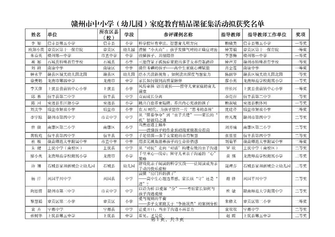 赣州市中小学(幼儿园)家庭教育精品课征集活动拟获奖名单