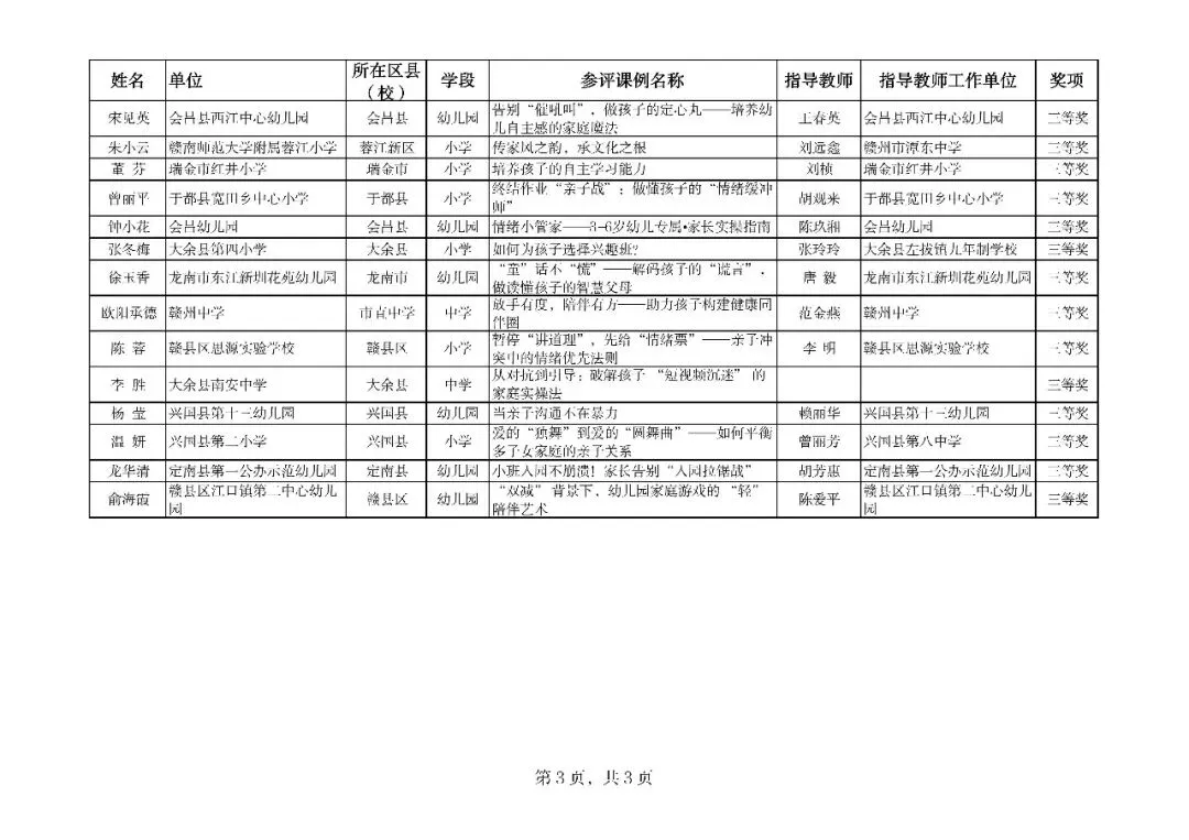 >赣州市中小学(幼儿园)家庭教育精品课征集活动拟获奖名单