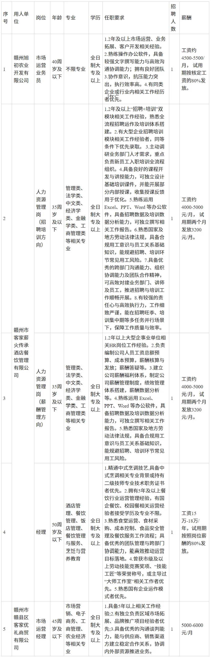 根据2025年12月29日发布的《赣州市赣县区文化旅游投资集团有限公司及旗下子公司招聘劳务派遣制人员公告》,经报名及资格初审,因市场运营业务专员、人力资源管理岗(招聘培训方向)、人力资源管理岗(薪酬管理方向)、经理岗及市场运营经理岗位报名人数达不到要求,经研究决定,报名延长至2026年1月12日17:30。岗位调整如下: