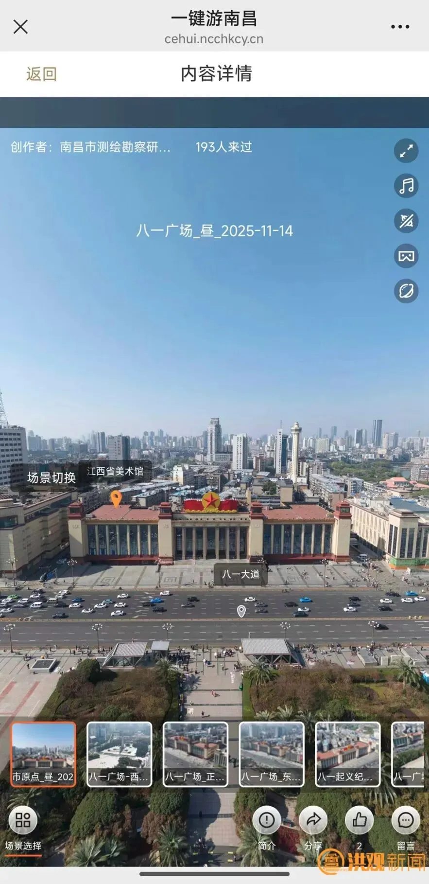 这背后,离不开“洪城鹰眼”文旅板块的技术支撑。依托高效的无人机航拍网络,南昌对全市重点文旅景区、历史文化街区实施全方位、常态化的影像采集与监测,持续更新720度全景影像。这些影像与南昌丰富的地名故事、文旅打卡地图深度融合,打造出沉浸式的“一键游南昌”体验,也为各景区建立起系统、可视的“数字档案”。